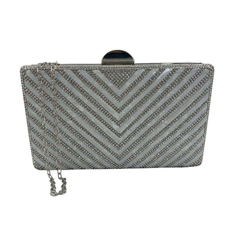 Bolsa de festa clutch de formato retangular, bordas quadradas, em acrílico rígido, acabamento liso, fecho de encaixe, interior forrado. Traz alça transversal removível.